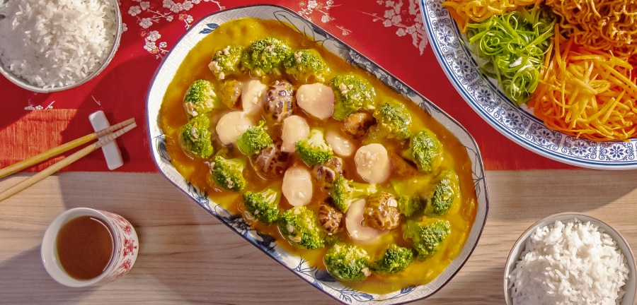 Steam the scallops until cooked. Separately, blanch the broccoli.