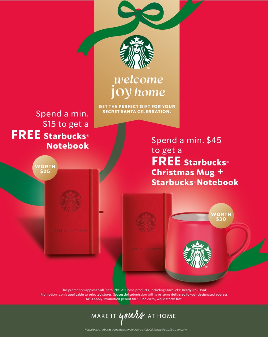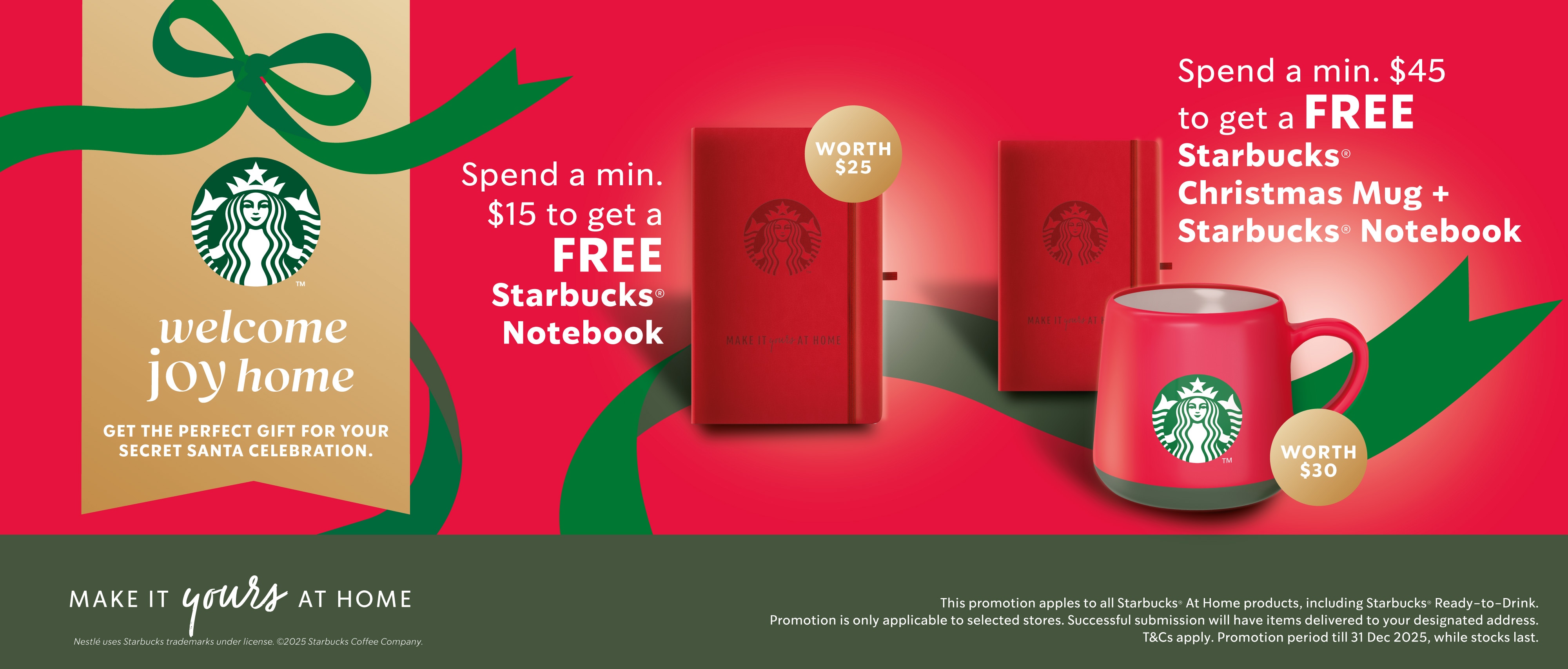 - $45 on STARBUCKS® at Home products (inclusive of STARBUCKS® ready-to-drink) at selected participating outlets and redeem 1 Starbucks® Festive Notebook and